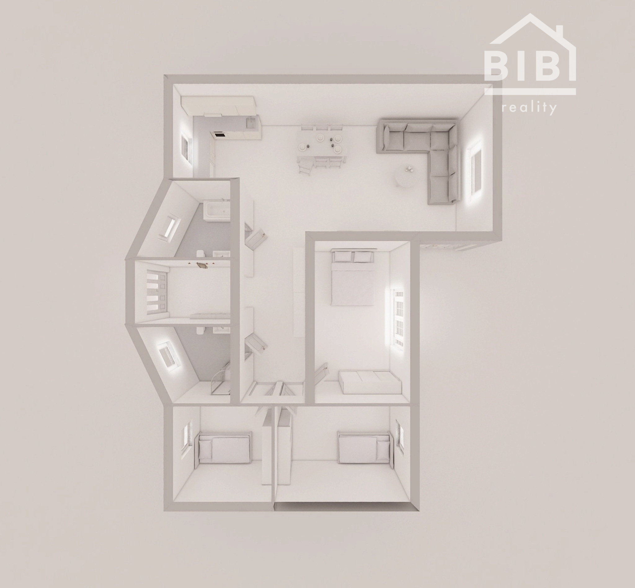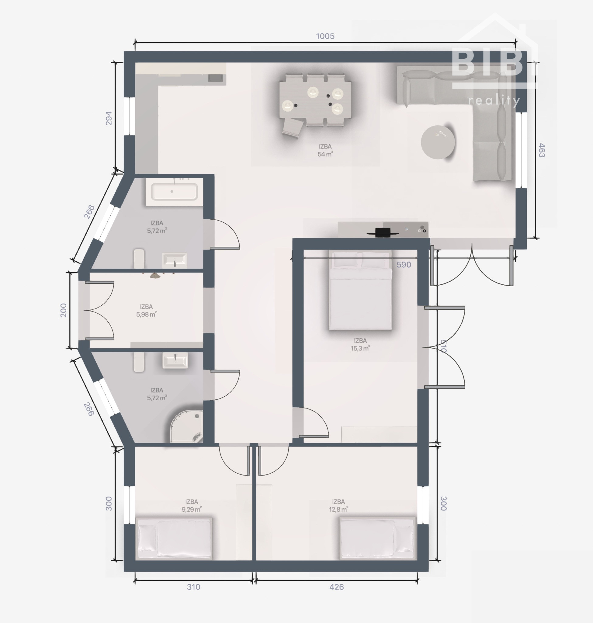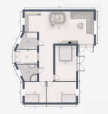 Predsieň, chodba, 3x spálňa, 2x kúpeľňa, kuchyňa s jedálenským stolom, obývacia izba.