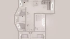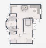 Predsieň, chodba, 3x spálňa, 2x kúpeľňa, kuchyňa s jedálenským stolom, obývacia izba.