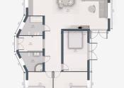 Predsieň, chodba, 3x spálňa, 2x kúpeľňa, kuchyňa s jedálenským stolom, obývacia izba.